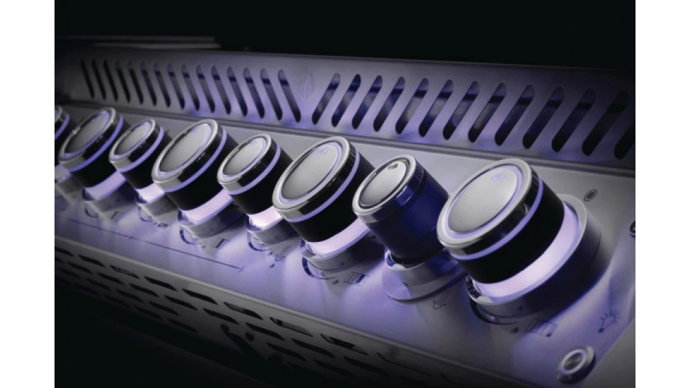 On the control panel, each dial is backlit with a stylish cycle lighting system. Lights will change colour until you choose the best effect for you. These lights will automatically turn on when you stand in front of the BBQ. As well as this, an illuminated Napoleon logo will project onto the ground when the lights are on. The lights will automatically turn off after 15 minutes if you are not standing in front of the BBQ. Internal lights in the hood make it easy to cook whatever time of day or night it is.